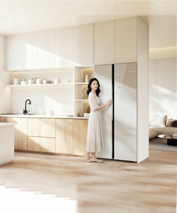 一张现代简约风格的洗衣机产品展示图,画面中央是一台白色滚筒洗衣机,洗衣机正面有圆形透明视窗、银色控制面板和旋钮,顶部放置着几瓶洗护用品,左侧地面有一个装满白色毛巾的编织篮和一株绿色植物。整体采用高清晰度的写实摄影风格,光线明亮柔和,以漫反射为主,营造出干净整洁、温馨舒适的氛围,色调以白色、浅灰色和原木色为主,色彩和谐统一。背景改变为简约的北欧风格浴室,墙面为浅灰色哑光瓷砖,地面是光滑的白色大理石,右侧有一个原木色置物架,上面整齐叠放着几条浅色毛巾,整体构图保持视觉平衡,突出洗衣机的现代设计感和实用功能。