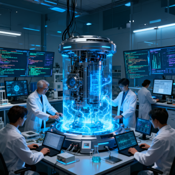 现代化高科技实验室场景,画面干净规整,适合作为背景。明亮的白色与蓝色调为主,洁净的白色墙面镶嵌着深蓝色方块瓷砖,地面为光滑的浅灰色。前景有两位身着全套白色防护服、佩戴护目镜和口罩的科研人员,一位正坐在操作台边专注查看电脑屏幕,另一位站立于大型精密仪器前操作控制面板。实验室中央和后方分布着多台先进的白色与银色相间的分析仪器、设备,带有蓝色显示屏和控制面板,仪器间有金属管道和电缆有序连接。右侧有机械臂装置,左侧前景有透明玻璃容器和绿色植物点缀。整体光线均匀柔和,以冷色调为主,营造出专业、严谨、先进且一尘不染的科研氛围,构图平衡,空间感强,视觉层次分明,信息传达清晰,符合高科技科研环境的审美与功能需求。