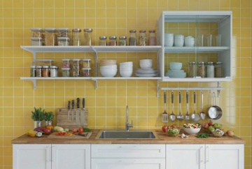 现代明亮厨房,双槽不锈钢水槽,小麦秸秆材质的米白色沥水篮,沥水篮里玻璃杯和不锈钢刀叉