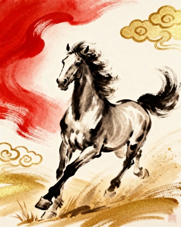 水墨风骏马奔腾,鎏金祥云点缀,红韵飘逸,工笔细腻,尽显国潮古典之美,寓意吉祥如意。