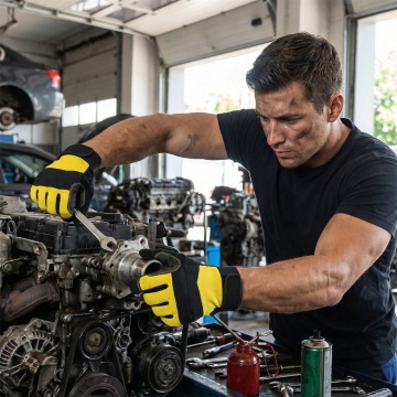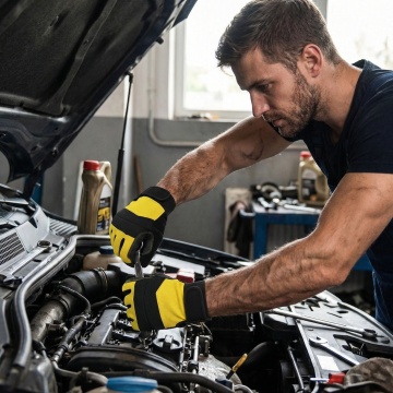 生成2张工人戴着图中手套汽车和制造(冷却剂、油、户外装配)工作的场景图