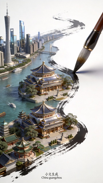 水墨风与3D风融合,毛笔挥洒间勾勒出广州古今交融的城市画卷,古典建筑与现代高楼在鎏金细节中辉映,国潮风韵尽显。