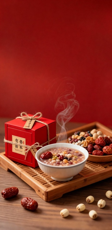 国潮风与重拟物结合,鎏金浮雕纹饰碗盛腊八粥,红金主色营造喜庆中式感,枝头挂饰与灯笼呼应节日氛围,传递浓郁复古年味。