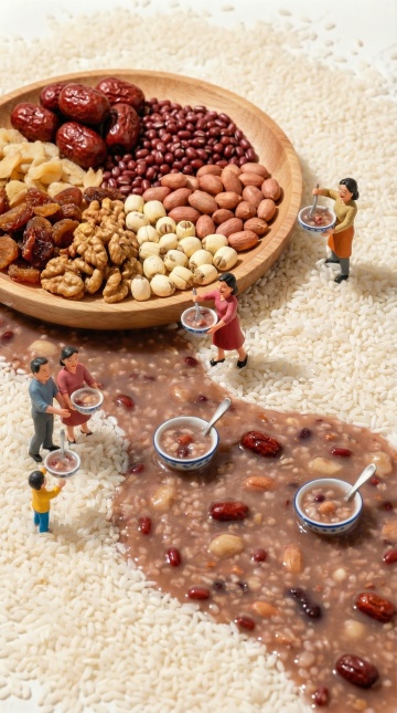 国潮风与重拟物结合,鎏金浮雕纹饰碗盛腊八粥,红金主色营造喜庆中式感,枝头挂饰与灯笼呼应节日氛围,传递浓郁复古年味。