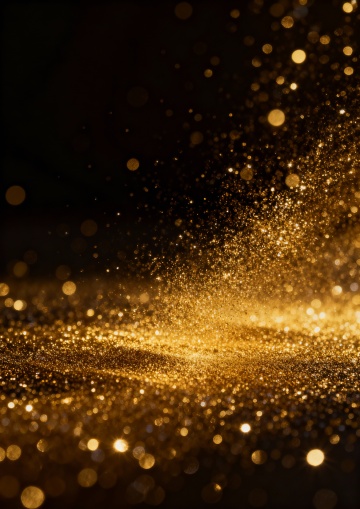 金色光斑在黑色背景上呈现出流动的、错落有致的分布,光斑大小不一,有明有暗,边缘柔和带有轻微的光晕效果,整体营造出梦幻而璀璨的氛围,仿佛夜空中闪烁的星辰,又似舞台上洒落的金色光芒,画面简洁而富有动感,光影层次丰富,金色与黑色形成强烈对比,突出光斑的视觉美感。