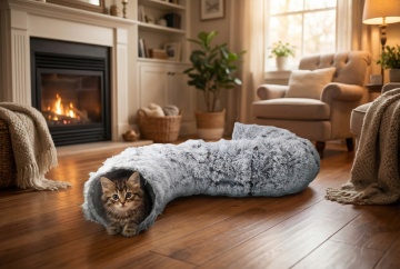 以图中的猫窝为元素,猫咪在猫窝,可爱安全的猫窝,温暖柔软,设计6张跟猫窝有关的图,物体主体特征不变,英语,比例 「16:9」「图片1」