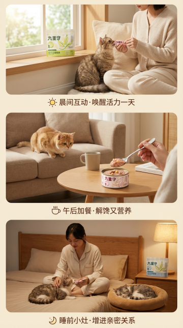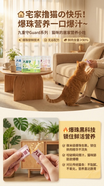 拟人风猫咪萌趣吐舌,3D质感猫粮环绕,大字风标语强化促销感,重拟物风设计突出真实美味,整体充满可爱与趣味,传递节日般欢愉的喂养体验。