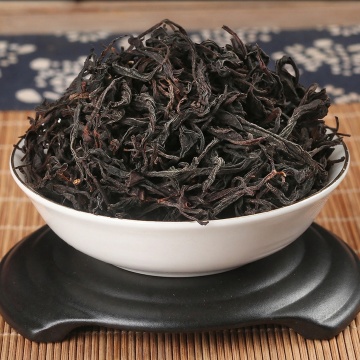 白色背景下,一个圆形竹编茶盘上放置着造型改变的乌龙茶茶叶,茶叶呈深褐色至墨黑色,叶片卷曲褶皱,带有自然舒展的形态,部分叶片边缘有红褐色点缀,整体呈现出干燥茶叶的质感和层次感,光线从上方柔和照射,茶叶表面有细微的光影变化,竹编茶盘纹理清晰可见,整体画面干净简洁,突出茶叶的自然形态和材质感。