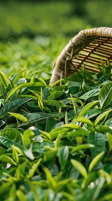 一个白色陶瓷小碗中盛满嫩绿挺直的茶叶,置于深色粗糙石质圆盘上,周围环绕新鲜翠绿的茶树叶片,柔和的晨光透过树叶洒下斑驳光影,营造清新自然的茶园氛围,浅景深特写,主体清晰背景虚化,色调以绿色为主,光影明亮柔和。