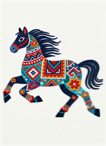 梦幻光影下的白骏马,融工笔风与国潮元素,鎏金刺绣点缀,极繁主义构图,尽显奢华唯美与古典优雅。