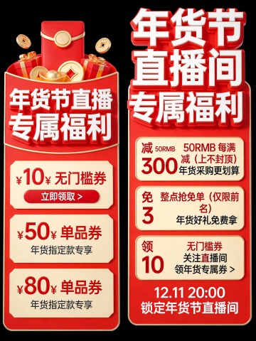3D重拟物风格,鎏金金属质感,红金配色营造喜庆促销氛围,突出直播间福利与限时优惠,视觉冲击力强。