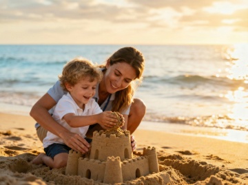 一位穿着白色吊带连衣裙的长发女子斜倚在柔软的米色沙发上,双手高高举起一个穿着白色连体衣的婴儿,婴儿悬空舒展着四肢,两人脸上洋溢着幸福灿烂的笑容。温暖柔和的自然光从窗外洒落,透过轻盈的白色纱帘形成朦胧的光影效果,照亮了整个室内空间。整体画面呈现出温馨、治愈的氛围,采用写实的摄影风格,色彩以柔和的米白色调为主,光影过渡自然,细节清晰,捕捉到母子间亲密互动的美好瞬间。