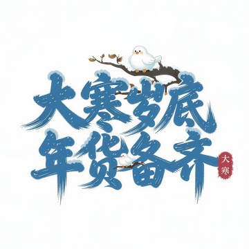 关键元素:浅蓝色艺术字体文字 “大寒年底 年货备齐”,字体表面覆盖薄雪纹理;文字上方搭配带雪的枯枝,枝上有 1 只圆滚滚的白色小鸟(点缀橙色喙爪);右下角红色印章样式 “大寒” 字样。 场景与构图:纯白背景,文字占据画面主体(上下两行排版),枯枝与小鸟置于文字上方空隙处,印章位于文字右下角,元素分布紧凑且协调。 色彩色调:主色调为浅蓝 + 白色(模拟冰雪感),搭配枯枝的深棕、小鸟的暖白 + 橙、印章的正红,整体冷色调中融入暖点缀,营造 “寒中带暖” 氛围。 画面风格:手绘插画风,线条柔和,质感细腻(字体雪纹、枯枝积雪有蓬松感),风格温馨治愈。 文字特征:字体为飘逸的书法变体,笔画圆润,带有轻微的水墨晕染效果,部分笔画覆盖自然落雪纹理。