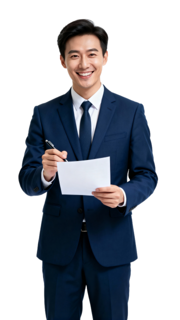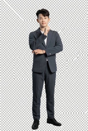 一位年轻亚洲男性,身着剪裁合体的黑色西装,内搭白色衬衫,系着黑色领带,左手自然插在西装裤口袋,右手轻握西装前襟,面带温和微笑,姿态自信挺拔,背景为纯白色,整体呈现清晰、专业、正式的商业人像摄影风格,光线均匀柔和,突出西装的挺括质感与人物的精神面貌。