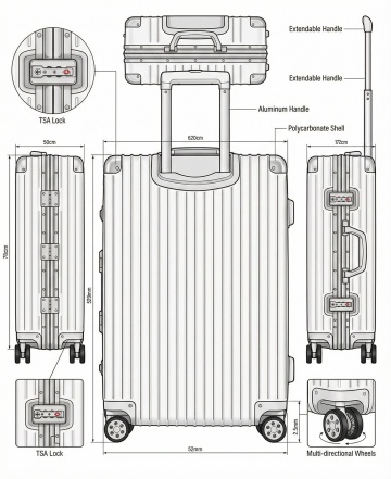 一个银色的硬质行李箱,具有金属质感的外壳,表面有垂直的细条纹设计,顶部配有银色伸缩拉杆,正面有一个矩形的锁扣装置,箱体侧面有银色的提手,底部装有四个黑色万向轮,整体呈现出简洁、现代、商务的风格,高光泽度的表面反射出柔和的光线,立体感强,放置在纯白色的背景上,构图居中,突出行李箱的主体形态和细节特征,适合作为产品素材展示。