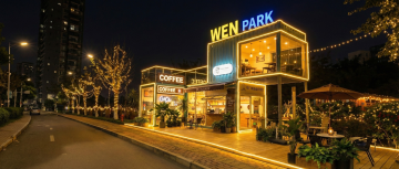 商业地产项目户外商业街黄昏透视图,现代简约建筑风格,玻璃幕墙与金属框架结构,暖黄色灯光从店铺透出,天空呈现渐变蓝紫色晚霞,点缀粉白色云朵,远处高楼林立,商业街行人悠闲漫步,店铺招牌隐约可见,地面铺设深色防滑地砖,两侧绿植盆栽点缀,整体氛围明亮通透、高端时尚,具有强烈的商业吸引力和空间纵深感,光影对比柔和,色彩和谐统一,符合商业宣传的视觉需求。