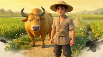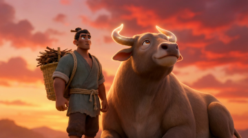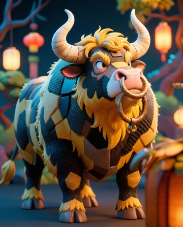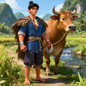 老黄牛(神牛化身) 外形:健壮黄牛,牛角弯曲有天然纹路,皮毛金黄光亮,双眼通灵性,四蹄踏云时可生祥瑞 特殊:开口说话时只有牛郎能听见,平时以普通牛形态出现 AI生图提示词:国萌3D卡通古风风格,神牛动物角色,金黄皮毛健壮黄牛,牛角有天然纹路,双眼通灵温柔,站在田野中,背景有金色光晕,整体色调金黄褐,皮毛质感真实,体型健硕,祥瑞气息