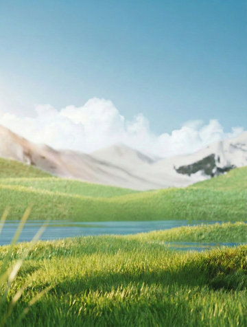 晨曦微露的天空下,一片生机盎然的绿色草坪,远处是茂密的深色松树林,阳光从林间斜射,在草坪上投下斑驳光影,营造出宁静而清新的氛围,草坪呈现出细腻的草叶质感和自然的波浪起伏形态。