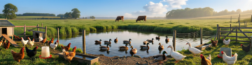 超写实风格的家禽系列素材集合,纯白背景,6个规整排布的独立元素,每个元素保持高度细节的摄影级质感和自然光影效果。从左到右、从上到下依次为:1. 站立的棕色母鸡,羽毛呈现暖黄色与深褐色渐变,尾部羽毛蓬松,头部有红色鸡冠和肉垂,眼神温和;2. 三个浅褐色带深棕色斑点的椭圆形鸡蛋,表面有细微的纹理和光泽,紧密排列;3. 一只黄色绒毛的小鸡,翅膀微张,抬头看向斜上方,脚爪细小呈橙黄色;4. 一只黑白相间的鸭子,身体肥胖,脖子弯曲,嘴巴扁平呈橙黄色,翅膀收拢紧贴身体;5. 一个编织的鸡窝,内部铺有干草,边缘有几根稻草散落;6. 一只灰色的鸽子,翅膀上有黑色条纹,尾巴展开呈扇形,站立姿态优雅。所有元素色彩真实自然,边缘清晰无阴影,整体构图平衡对称,每个元素大小一致,间距均匀。