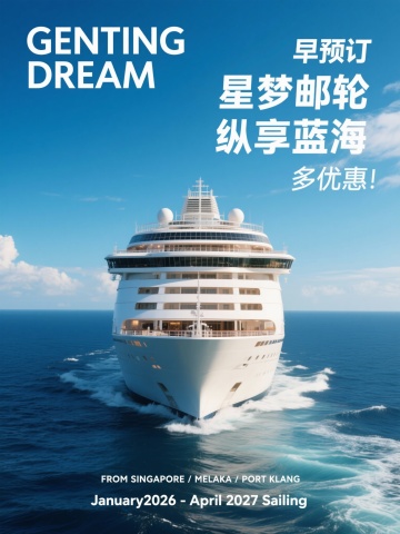 白色背景下的现代豪华邮轮正面航行图像,金属质感的船体与全景玻璃窗,蓝白渐变色涂装,船尾海浪呈放射状飞溅,多只海鸥环绕飞翔,采用扁平化矢量风格,线条简洁明快,色块分明无笔触纹理,明亮高饱和色彩,清晰轮廓线,极简光影处理,无渐变晕染效果。