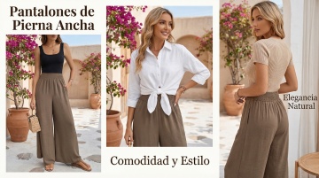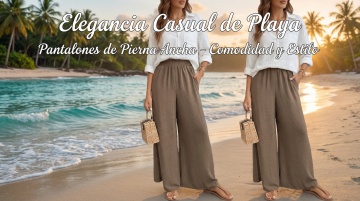以图中的女士休闲阔腿裤为元素,欧美女人穿着休闲阔腿裤,设计6张跟女士休闲阔腿裤有关的图,物体主体特征不变,西班牙语,比例 「16:9」「图片1」