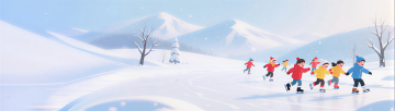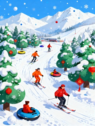 插画风与3D结合,呈现梦幻雪景中的滑雪乐园,光影交错,人物生动,营造清新舒适氛围,虚拟现实感十足。