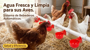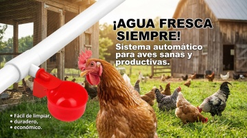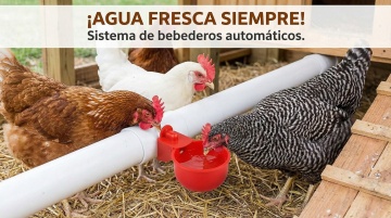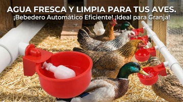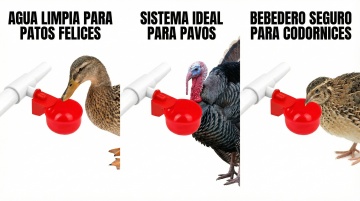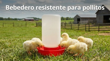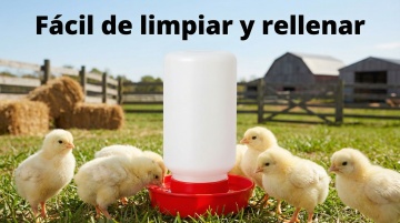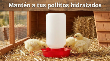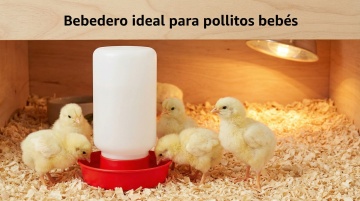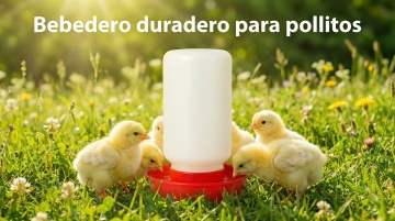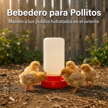 以图中的雏鸡饮水器为元素,小鸡在喝水,,设计6张跟雏鸡饮水器有关的图,物体主体特征不变,西班牙语,比例 「16:9」「图片1」