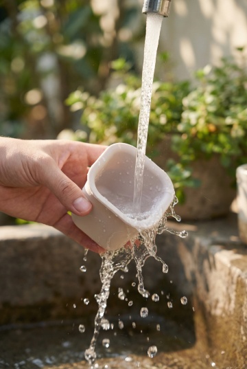 一张以不同画面的水龙头为背景的写实风格摄影照片,画面主体为一个亮银色的金属水龙头,水龙头正流出清澈的水流,水流在白色的洗手池表面形成柔和的水花和水痕。水龙头设计有精致的旋钮和弯曲的出水口,金属表面光滑且有细腻的反光,展现出良好的质感。背景中可以看到模糊的绿色植物和木质纹理,光线从左侧窗户射入,形成柔和的自然光效果,整体氛围清新、宁静、生活化,具有温暖的居家感。画面焦点清晰地落在水龙头和水流上,背景适当虚化,突出主体。