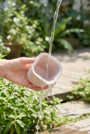 一个设计精美的水龙头特写,水龙头主体为亮银色金属材质,表面光滑且有清晰的反光效果,水流从出水口呈细长的弧线状自然滴落,汇入下方洁白的洗手盆中,盆内水面有细微的涟漪。背景柔和模糊,左侧有木质纹理的窗框,透过窗户能看到朦胧的自然光洒入,右侧摆放着一盆绿色植物,叶片舒展,整体色调温暖和谐,营造出宁静、干净、自然的居家氛围,光线柔和,阴影细腻,具有写实的摄影质感,画面聚焦于水龙头和水流,细节清晰,突出产品的精致与功能性。