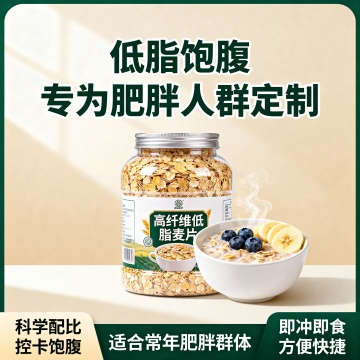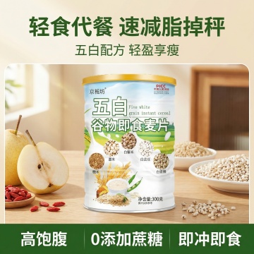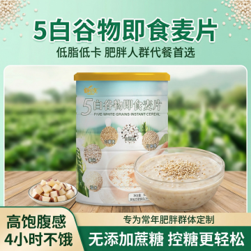 帮我依据这款五白谷物麦片,生成2张场景不一样素材的主图,比例为1:1主要围绕轻食代餐,速减脂掉秤