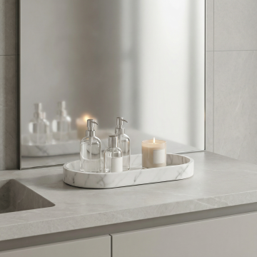 极简主义风格的卫生间室内设计,柔和的米白色与浅灰色调为主,整体明亮通透,自然光透过隐形光源均匀洒入,营造出干净、宁静、高级的氛围。浴室中央是悬挂式米白色洗手台,台面光滑整洁,台上放置简约设计的水龙头和几瓶透明瓶装洗漱用品,台下有隐藏式抽屉和开放式储物格,内置叠放整齐的毛巾与洗漱用品。洗手台上方是带LED灯带的长方形镜面柜,柜内隐约可见折叠整齐的毛巾,镜面清晰映照出浴室景象。右侧是白色壁挂式马桶,线条流畅。左侧为透明玻璃淋浴房,内部有简约的置物架和手持花洒。墙壁采用大块浅色瓷砖铺设,地面是光滑的白色大理石瓷砖,整体空间布局紧凑有序,功能分区明确。金属色毛巾架上挂着白色毛巾,与整体色调和谐统一。设计注重空间的简洁性与功能性,无多余装饰,强调材质本身的质感与光影的细腻变化,呈现出现代、简约、舒适的卫浴空间。