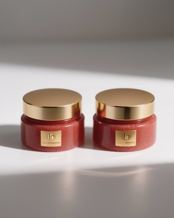 帮我生成一个高档红色塑料材质眼霜,金色瓶盖,金色LOGO标签,白色背景