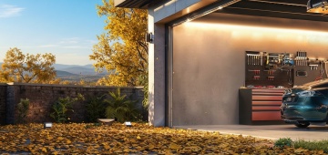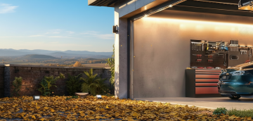 去除右侧墙上的打气筒和手套背包,墙角放一个灭火器,左侧铁皮柜上放一个户外电源及野营灯(熄灭),自行车换一种配色
