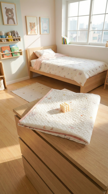 极简主义风格的儿童卧室,温暖柔和的原木色与米白色为主色调,自然光从侧面窗户洒落形成柔和的光影效果,细腻的木质纹理与编织质感的地毯和收纳篮,浅米色墙壁上挂着装饰画,不同形态和布置的木质家具(如带抽屉的储物柜、简约单人床),地面散落着不同尺寸的毛绒玩具熊,整体营造出温馨舒适、简约自然的氛围,干净整洁的空间布局,柔和的光线带来宁静惬意的感觉,不同布置的背景中保持原木色系与编织元素的统一风格。