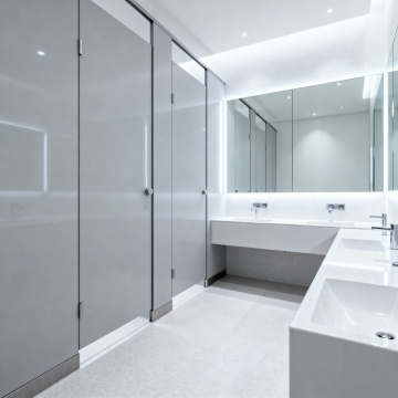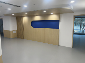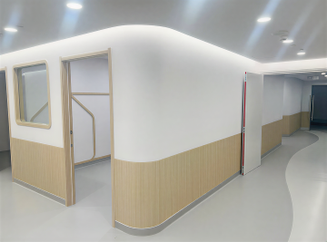 超写实风格医院走廊内部场景,明亮柔和的自然光与人工照明结合,天花板嵌入式筒灯与长条灯带提供均匀光线,地面为光滑反光的浅蓝色环氧地坪,墙壁采用浅蓝色与米白色渐变搭配,白色方形吊顶,走廊左侧为弧形护士站,配备电脑、文件架和绿色盆栽,右侧摆放医疗设备与座椅,整体色调以蓝白为主,营造干净、专业、宁静的医疗氛围,空间宽敞通透,景深效果明显,光影过渡自然,细节清晰,无LOGO、电话地址及二维码。