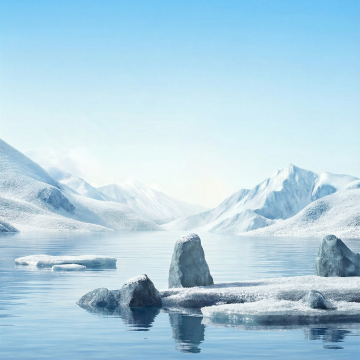 超写实摄影风格,清澈透明的冰块从蓝色水面中溅起,水花与冰晶在阳光下折射出耀眼光芒,背景是平静的湖面和远处朦胧的山脉,整体色调以纯净的蓝白为主,光线明亮柔和,营造出清冷、通透、宁静而富有生命力的氛围,冰块形态棱角分明,表面光滑带有自然纹理,水珠在冰面和水面上晶莹剔透,画面层次分明,近景冰块细节清晰,远景山峦虚化,展现出冰与水交融的动态瞬间。