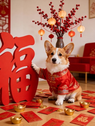 写实摄影风格,图中宠物身着中式红色新年服饰。直视相机。它用手扶着一个巨大的红色汉字“福”,宠物位于左侧。宠物周围是四散分布大量红包和金元宝散落在地板上,背景为居家环境(融入红色装饰元素),远处有一株红色仿真冬青果树在花瓶里,以树枝为载体,用红绳错落悬挂多小灯笼;整体氛围以暖色调为主,营造新春喜庆装饰氛围。