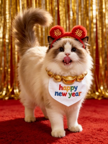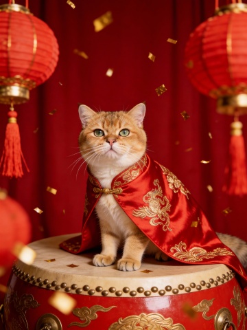 国潮风猫穿唐装,拟人化演绎春节喜庆,鎏金元宝与剪纸“福”字点缀,实景感中式家居氛围浓郁,红灯笼映衬吉祥年味。