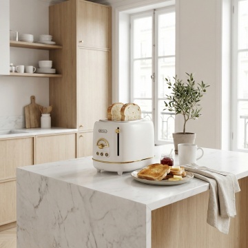 图片风格为「人像摄影」,场景是美式的开放式厨房,面包机在右侧前面、突出面包机,面包机放在桌子上,桌面采用白色大理石的桌面,左侧后面是米白沙发和白人女模特在看书的场景,右侧是厨房色的沙发,背景虚化模糊的效果。