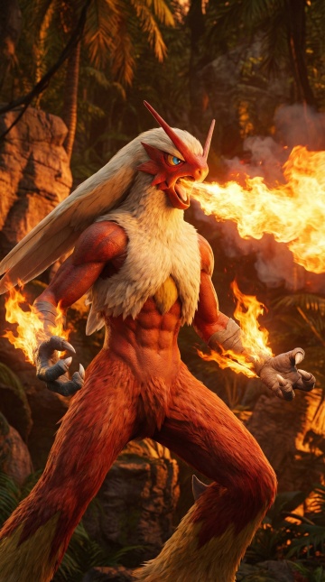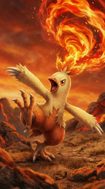 火焰鸡在熔岩地貌中昂首怒吼,3D重拟物风结合插画质感,火羽如瀑,粒子飞溅,充满热血与冲击感,呈现虚拟现实般的视觉盛宴。