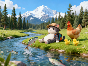 软3D风拟人动物在梦幻自然中野餐,雪山溪流间透出清新与舒适感,可爱卡通风格营造童话般的节日氛围。