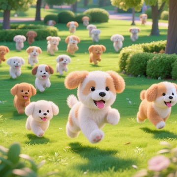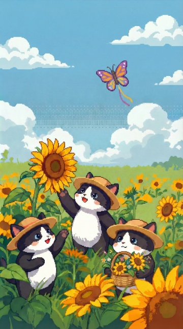 画面主体:主角:9只黑白相间的奶牛猫,每只都戴着棕色的草帽和蓝白格子围巾动作:三只小猫排成一列在泥土地上奔跑,最前面的小猫抬起一只爪子,表情兴奋开心,嘴巴张开像是在欢呼细节:小猫们的毛发质感柔软,黑白斑点清晰可见,草帽和围巾的细节精致农场环境:道路:泥泞的农场小路,路面有小水洼和干草堆,显得非常真实菜园:道路两旁是整齐的菜园,种植着绿色的蔬菜,有木栅栏围起来背景:远处有一个红色屋顶的小棚屋,周围是金黄色的玉米地和绿色的田野动物:一只棕色的母鸡在菜园边悠闲地踱步,增添了农场的生活气息整体氛围:光线:温暖的阳光洒在整个场景上,营造出明媚的乡村氛围色彩:以绿色、金黄色和泥土色为主调,色彩丰富而和谐画面主体:主角:10只黑白相间的奶牛猫,每只都戴着棕色的草帽和蓝白格子围巾动作:三只小猫排成一列在泥