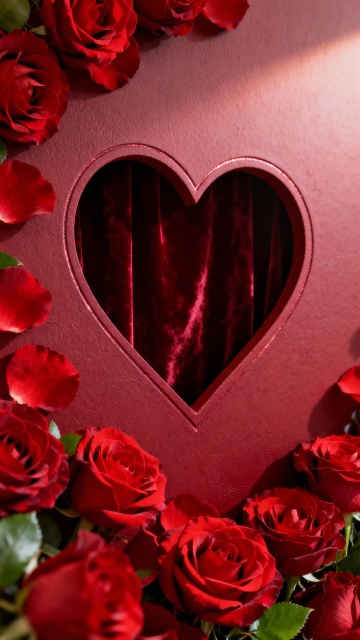 浪漫唯美的情人节主题设计,重拟物风与浮雕质感结合,心形窗框透出丝绒光影,红玫瑰环绕,尽显奢华与细腻质感。