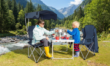 森林露营场景:加宽的桌子摆在林间空地上,一对情侣坐在两侧折叠椅上,男生正把大号保温箱里的食材摆上桌,女生拿着烤盘在桌角准备烧烤,背景是高大的松树,阳光从枝叶间洒在桌面上