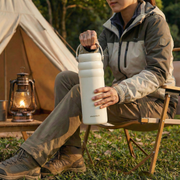 轻拟物风结合肌理风格-金属风,实景感与光影感交织,营造质朴温馨的露营氛围,现代感水壶凸显舒适清新,自然与设计和谐共生。