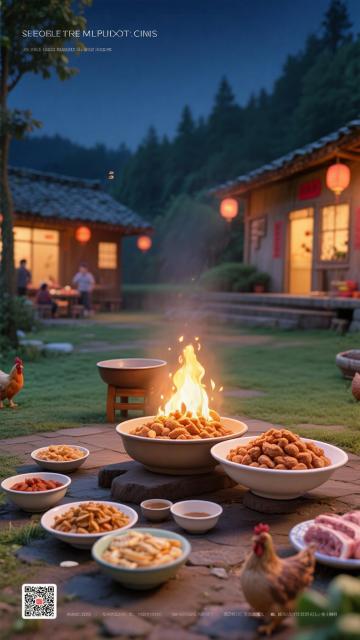 水墨风与重拟物结合,古典庭院雪景中热气腾腾的鸡汤氤氲温暖,插画风呈现中式冬日温馨梦境,融合节日祥和氛围。