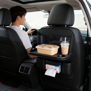 长途自驾场景(细节特写角度) 置物板上摆着车载香薰和手机支架(手机正在导航),杯架插着保温杯,下层拉链袋里露出充电线,重点展示置物架的分层收纳和小物件摆放效果
