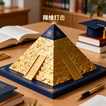 一座由深紫色与暗金色渐变玻璃方块堆叠而成的巨大向上箭头,悬浮在黄昏时分被橘红色与深紫色霞光浸染的城市上空,箭头表面有细腻的金色反光与紫色磨砂质感,一位身着黑色西装的男子站在箭头顶端边缘,背对着观者望向远方,脚下是鳞次栉比、笼罩在暮色阴影中的摩天大楼群,天空中漂浮着几缕被霞光染成金红色的云彩,整体呈现出神秘而奢华的赛博朋克风格,光影对比强烈,箭头的立体感与城市的纵深感通过明暗交错的光影和渐变色彩凸显出来。