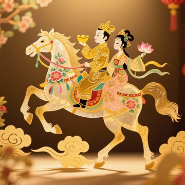 主体是穿红衣的孩童们(有的踮脚贴春联、有的手提宫灯、有的点燃小烟花),画面下方是财神骑粉橙色骏马(装饰红蓝如意纹、橙金流苏),骏马前蹄踏元宝,嘴衔福袋,神态娇憨;场景为中式院落门庭;背景为米黄底色 + 红金渐变暗纹(带福字印花);凸显春节贴联纳福的喜庆氛围