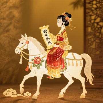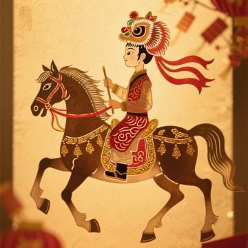 国潮插画风,拟人童趣与鎏金马匹相映,剪纸元素点缀,红金配色尽显中式喜庆,烟花灯笼烘托新春氛围。